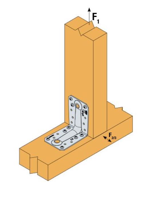 F1 Lyftande kraft som verkar i vinkelbeslagets centrala axel, men på avstånd från vinkelbeslagets vertikala flik. Om åsen är förhindrad att rotera, blir bärförmågevärdet hälften av bärförmågan för en fog med två vinkelbeslag.