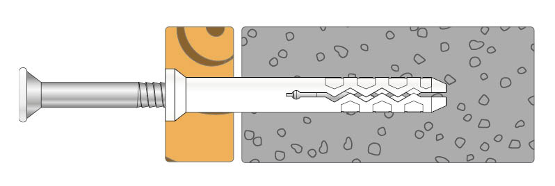 Spikpluggen monteras snabbt och enkelt i betong eller massivt tegel. Spikplugg med försänkt krage används vid montering av reglar, socklar och köksinredningar.
