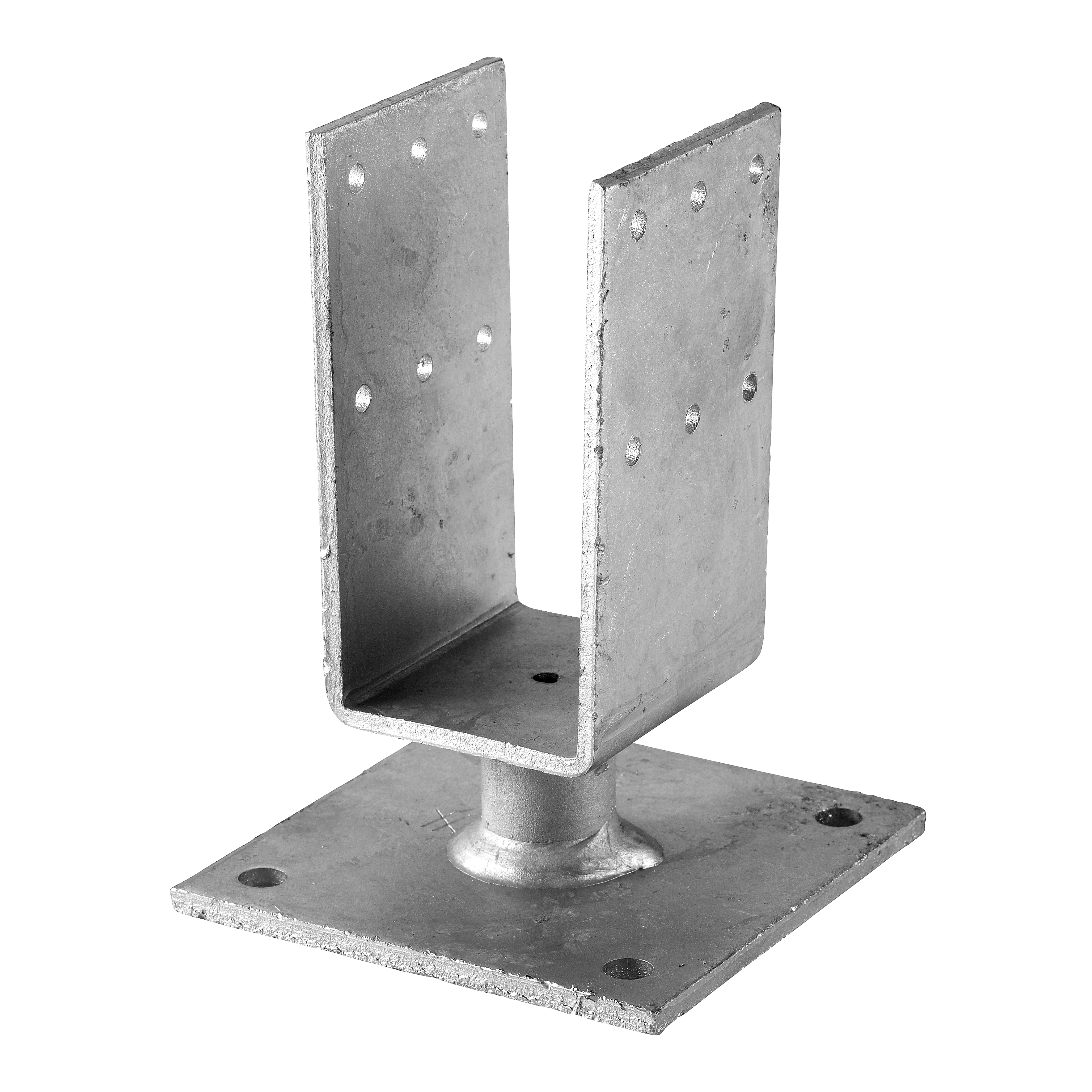 Beslaget består av en 4 mm tjock U-format stålplåt med Ø5 mm hål och en 5 mm tjock, kvadratiskt stålplatta med Ø9 mm hål. Mellan dessa delar har en Ø24 mm rundstång svetsats fast. Beslaget har varmförzinkats efter bearbetning.