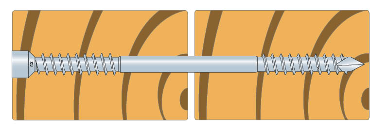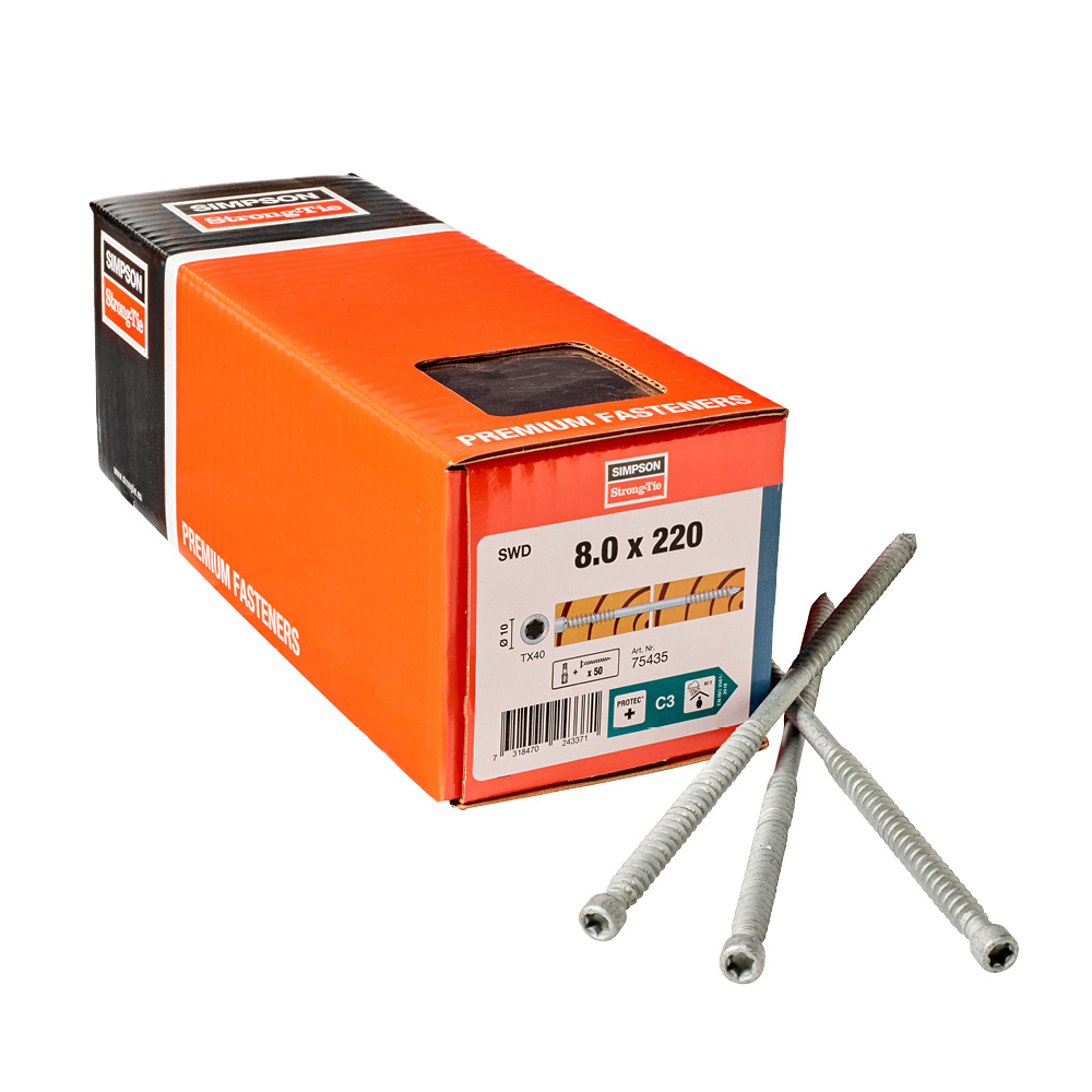 Träskruv dubbelgängad SWD används för montage i tyngre konstruktioner som exempelvis limträbalksystem samt även träkonstruktioner där montaget ska vara dolt. Skruven är ytbehandlad med Protec+ som är en C3 klassad och slitstark ytbehandling för utomhusmiljö. Spikspetsen ger en fin sänkning utan flisbildning.