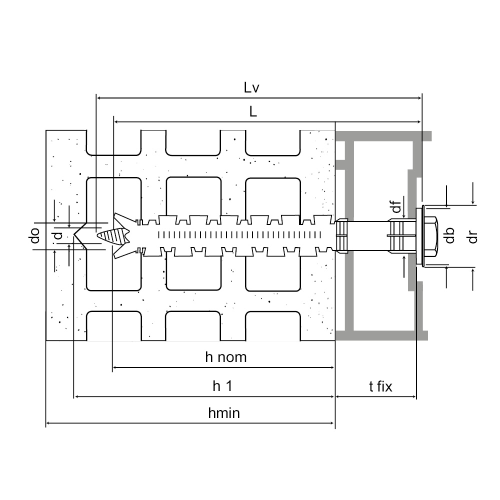 | Ø borrhål [d0] [mm] | Min. borrdjup [h1] [mm] | Ø borrfixtur [df] [mm] | Wrench size [SW] [mm] | |||
